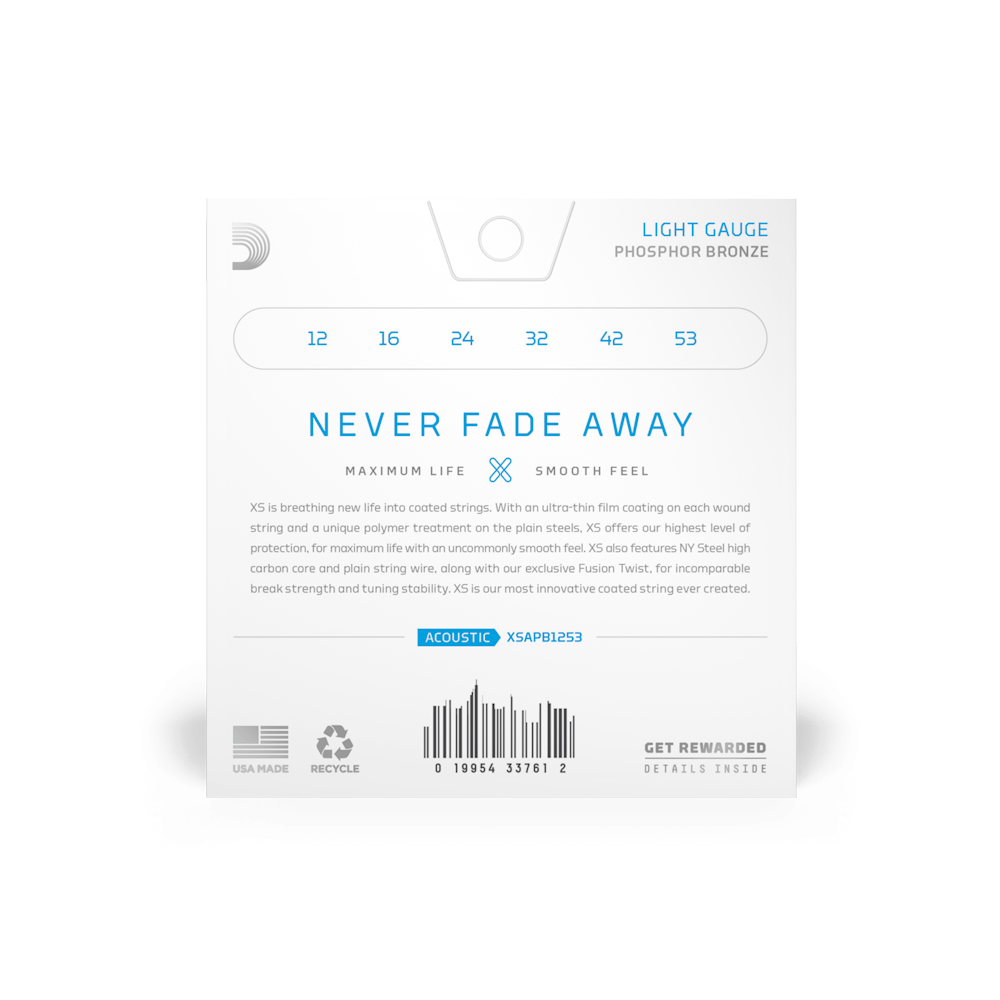 Born from our greatest breakthrough in string innovation, XS Phosphor Bronze strings have the longest life of any D’Addario acoustic guitar string. The XS coating gives our warm, balanced phosphor bronze strings maximum life, with an uncommonly smooth feel. Made with a NY Steel core, phosphor bronze wrap wire and Fusion Twist technology, XS coated acoustic guitar strings have incomparable break strength and tuning stability, in addition to their dramatically increased lifespan. 12-53 Light strings are our most popular acoustic gauge, providing a nice balance of playability and tone.
