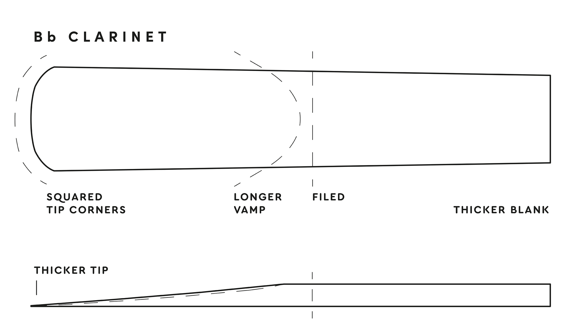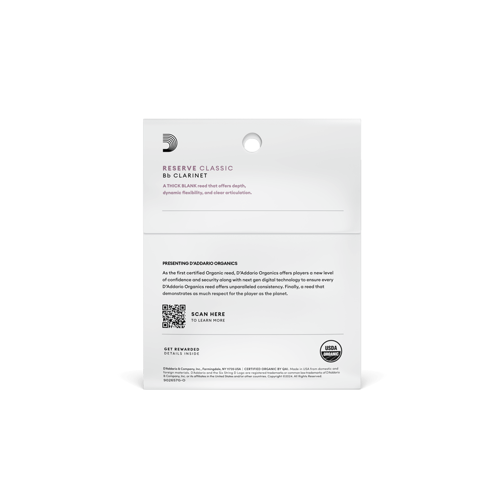 Crafted with a longer vamp for flexibility of color and volume, Organic Reserve Classic Bb Clarinet reeds contain squared tip corners for ease of response, plus a thicker tip for added support. Each reed in the pack comes individually-sealed in a recyclable paper reed holder and flow wrap.